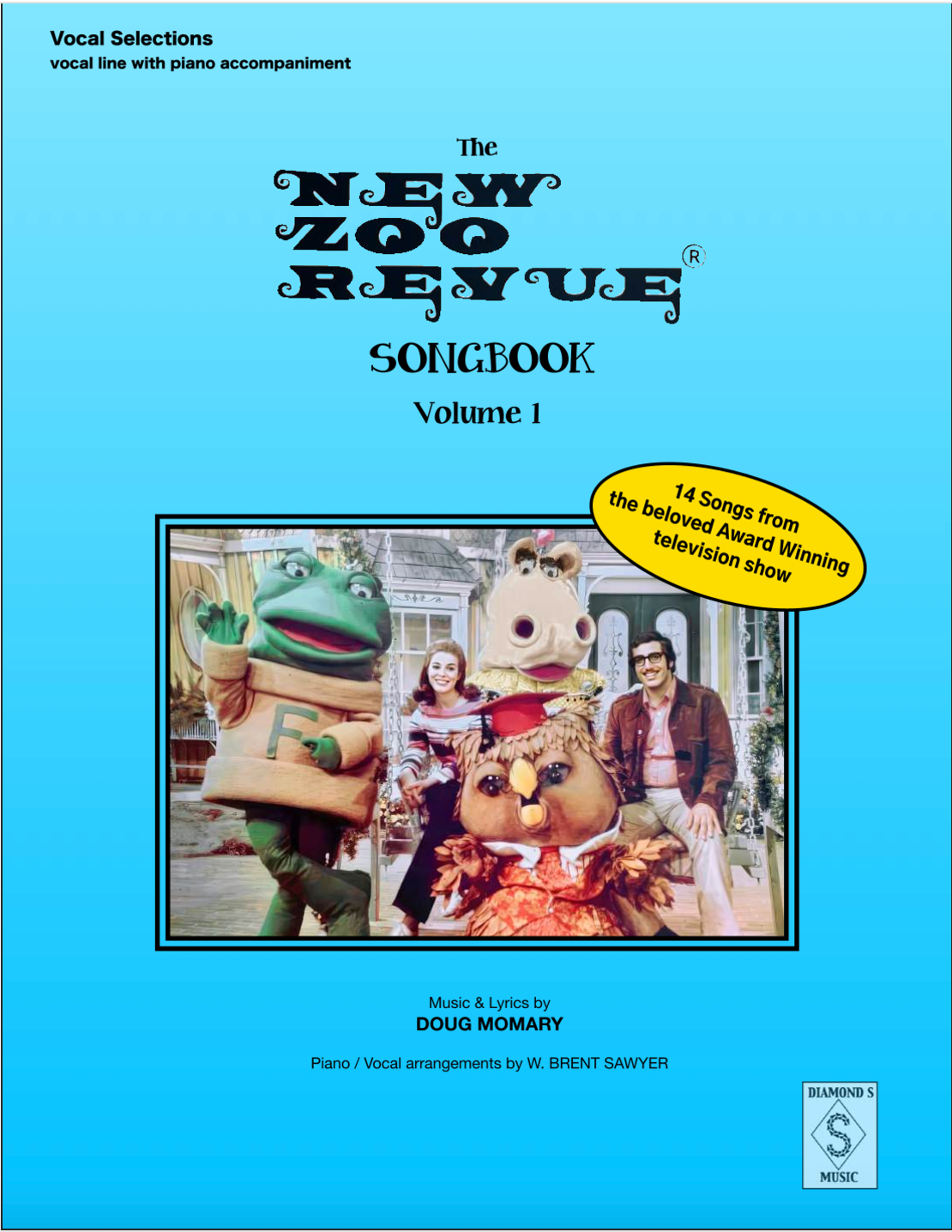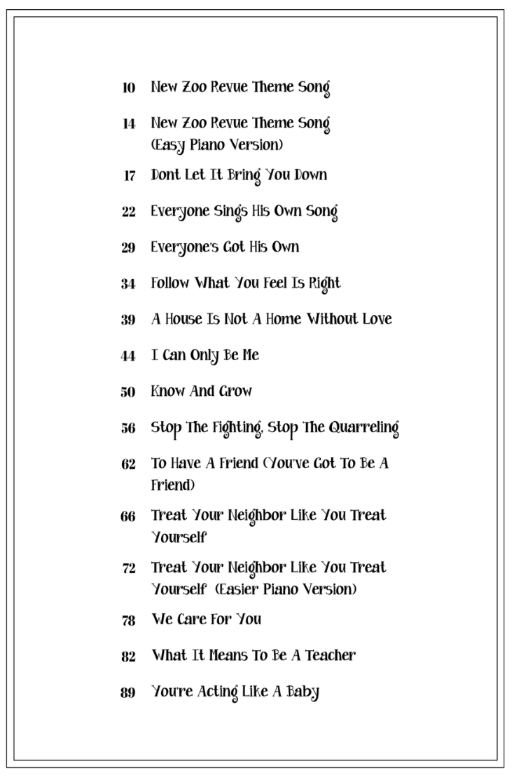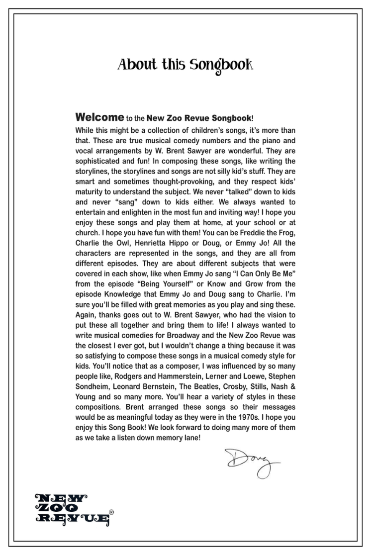 For the first time ever, 14 songs (including the famous Theme Song) from the popular syndicated 1970s Children’s television show, NEW ZOO REVUE are available here in sheet music in this 92 page Songbook. Arranged for Voice and Piano accompaniment with Guitar chords above. Two of the songs even have 2 arrangements included - the "original version" and an "easier piano part" version. Also included is New Zoo Revue Show overview info, a message from Doug, Biographies of Doug & Emmy Jo, 2 pages of color photos from the show. The show ran from 1972-1977 and had 196 episodes and 600 original songs all written by Doug Momary, who also starred in the show alongside Emmy Jo, Freddie the Frog, Charlie the Owl and Henrietta Hippo.